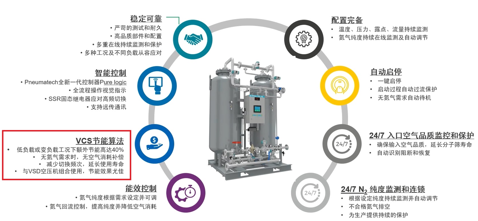 纽曼泰克制氮机PPNG 采用的是一个双塔式结构,通过两塔优选的碳分子筛,再结合优化的工艺流程和节能控制技术,实现了出色的空氮比。其中VCS节能算法,可优化双塔的切换周期,节能高达40%。